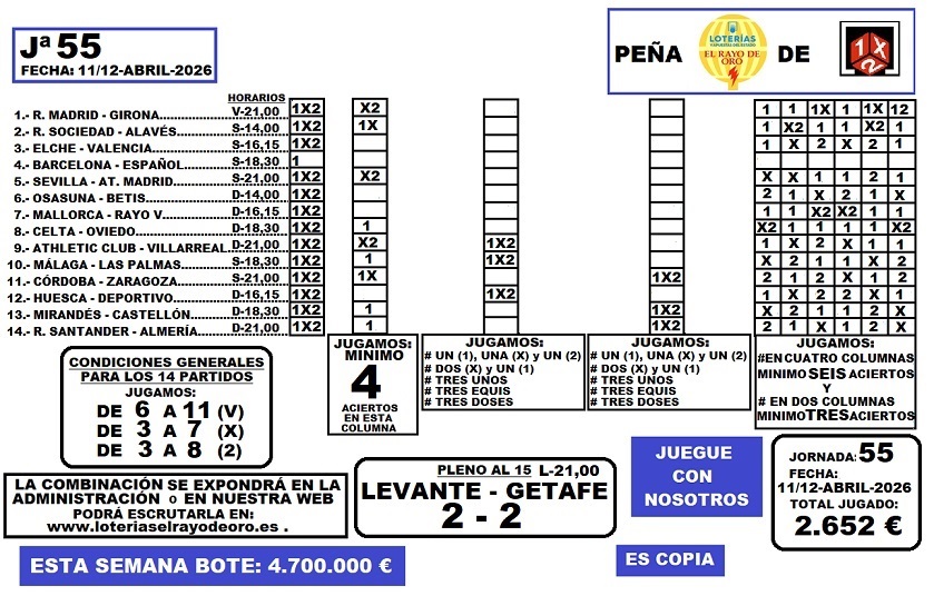 PEÑA 1X2 RAYO DE ORO Jª55
